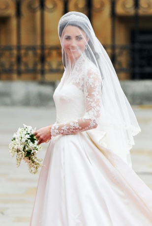 Kate looked stunning in her long sleeved dress with lace appliqué bodice, satin gazar pleated skirt and nine-foot train.